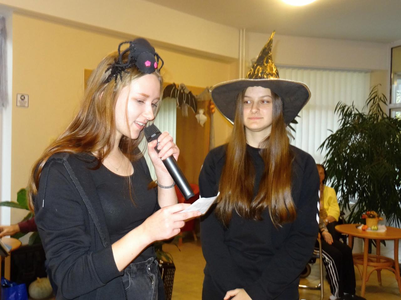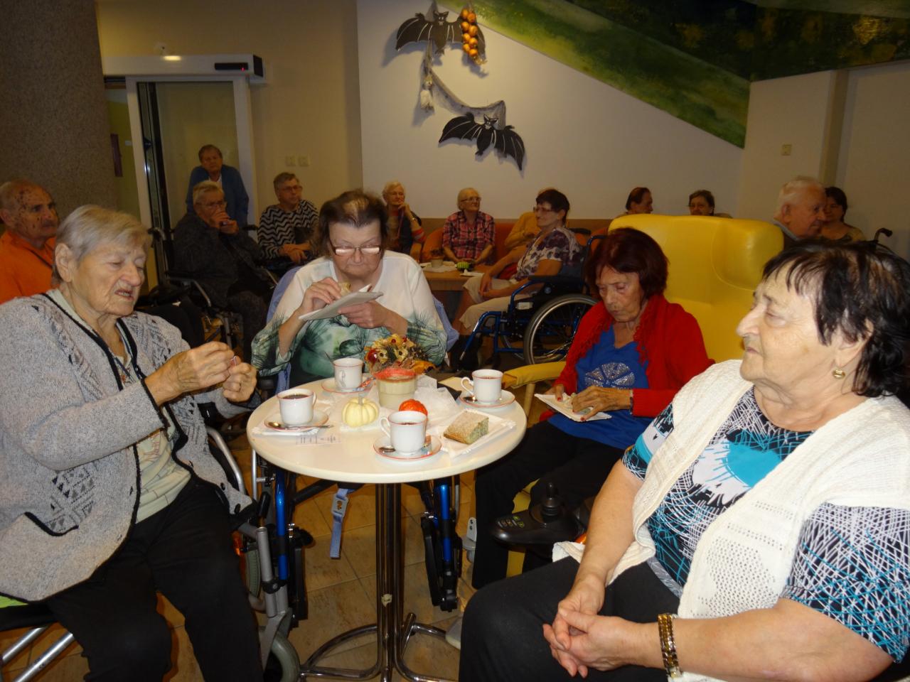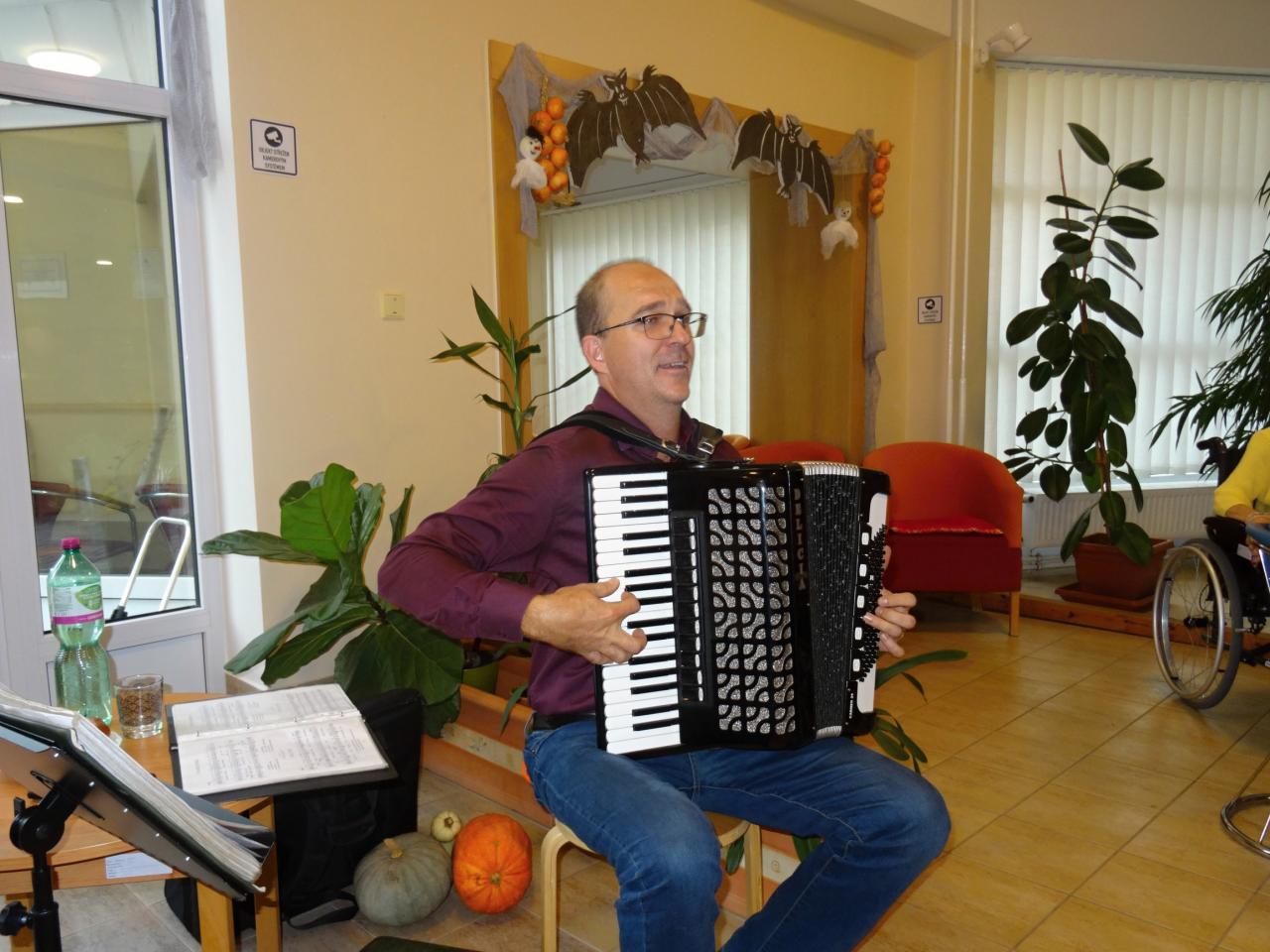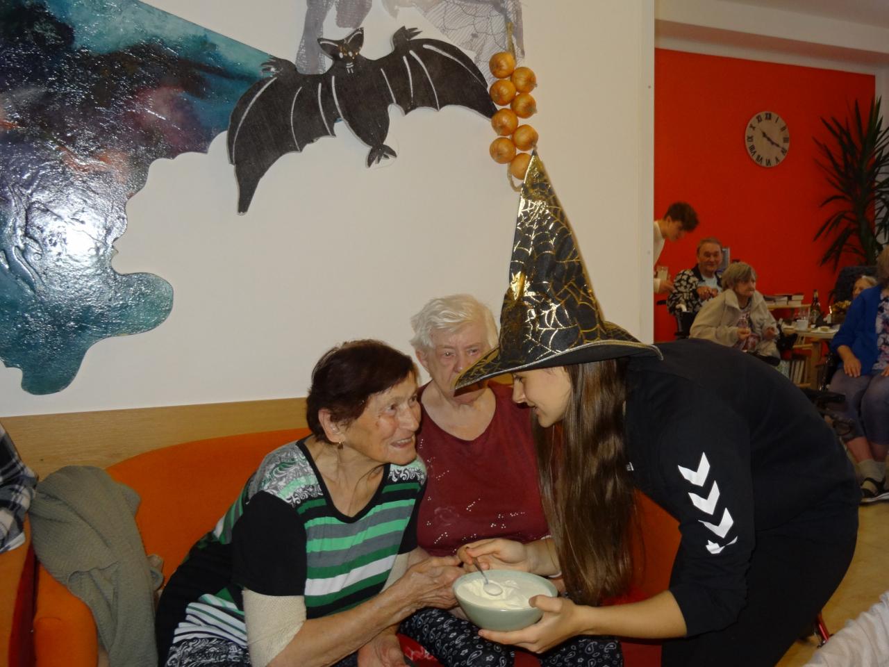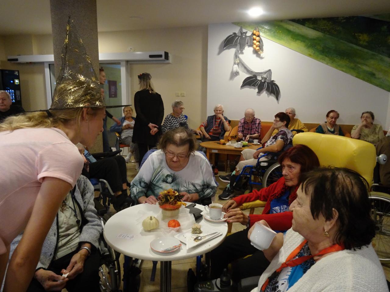 Úterní dopoledne se neslo v duchu keltského svátku Halloween, který je obdobou našich dušiček. Ve vstupní hale se konalo posezení uživatel s malým pohoštěním a vystoupením pana harmonikáře. Posezení obohatily svou přítomností i studentky oboru Nutriční terapeut ve stylových kostýmech.