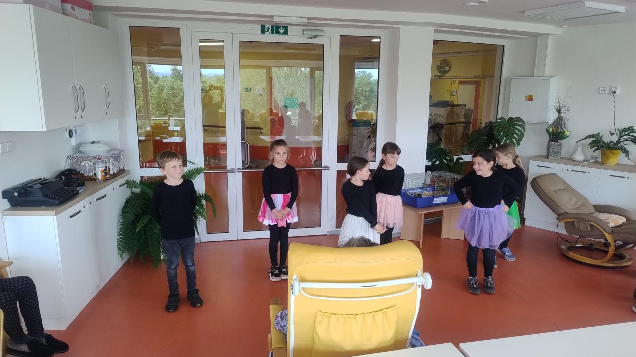 Ve středu 29. 5. 2024 se uskutečnilo na Domově IV další setkání uživatelů s dětmi z družiny. Nejprve děti zazpívaly písničky a zatančily tanec, který si pro naše uživatele připravily. Potom se společně naučili krátký taneček. Na závěr vyráběly děti s uživateli ptáčky do oken nebo na zeď.