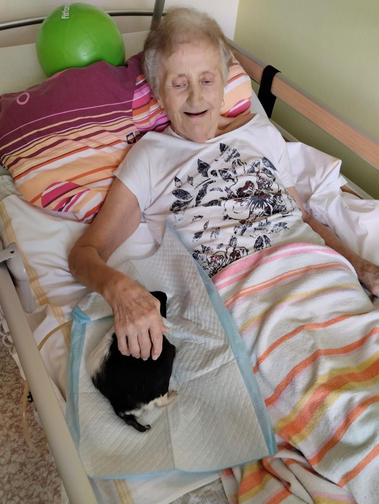 Dne 26. a 27. června probíhala na pokojích klientů terapie s morčetem Melicharem. S uživateli jsme si povídali a zároveň vzpomínali na jejich zvířecí mazlíčky.