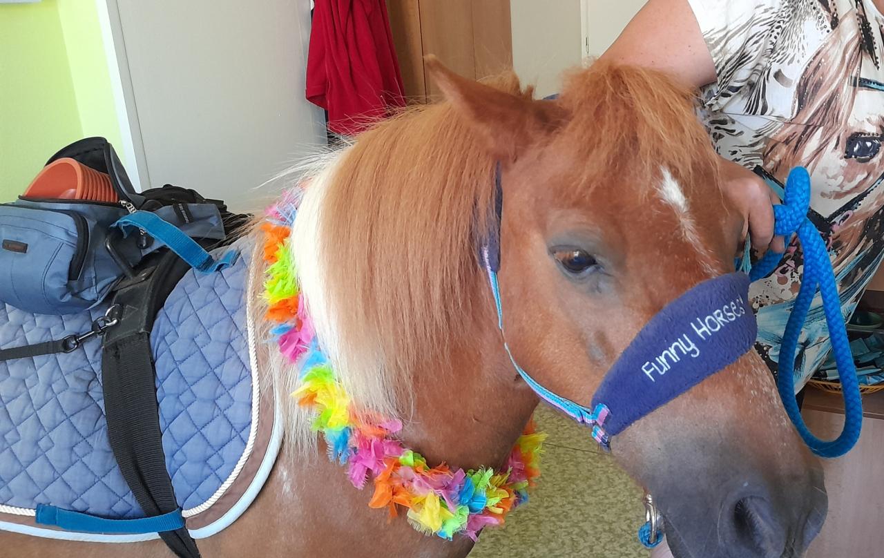 Ze startu měsíce července jsme v domově přivítali opět poníka Ondráška. Tentokrát Ondrášek navštívil uživatele na pokojích formou individuální terapie. Pro uživatele, kteří se z jakéhokoliv důvodu nemohou účastnit skupinové ponyterapie ve společenské místnosti, přinášíme možnost kontaktu s poníkem přímo na pokoji. Tato forma terapie obohatila běžný den o výjimečný zážitek.