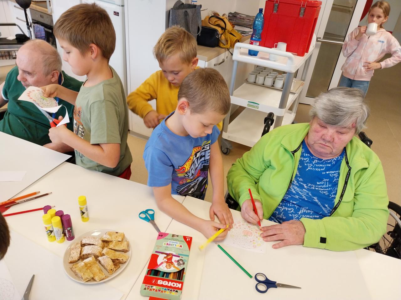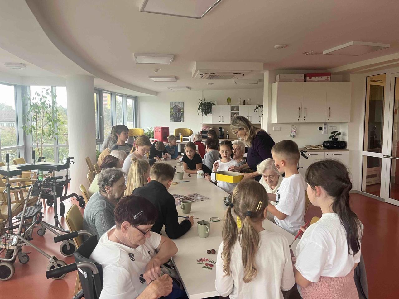 Ve středu 1.10.2025 přišly poprvé po letních prázdninách za našimi uživateli děti z družiny 4. a 7. ZŠ. Společně se s uživateli pustily do podzimního tvoření, které si připravily. Na závěr setkání uživatelům popřály k dnešnímu Dni senioru a společně si s nimi zazpívali.