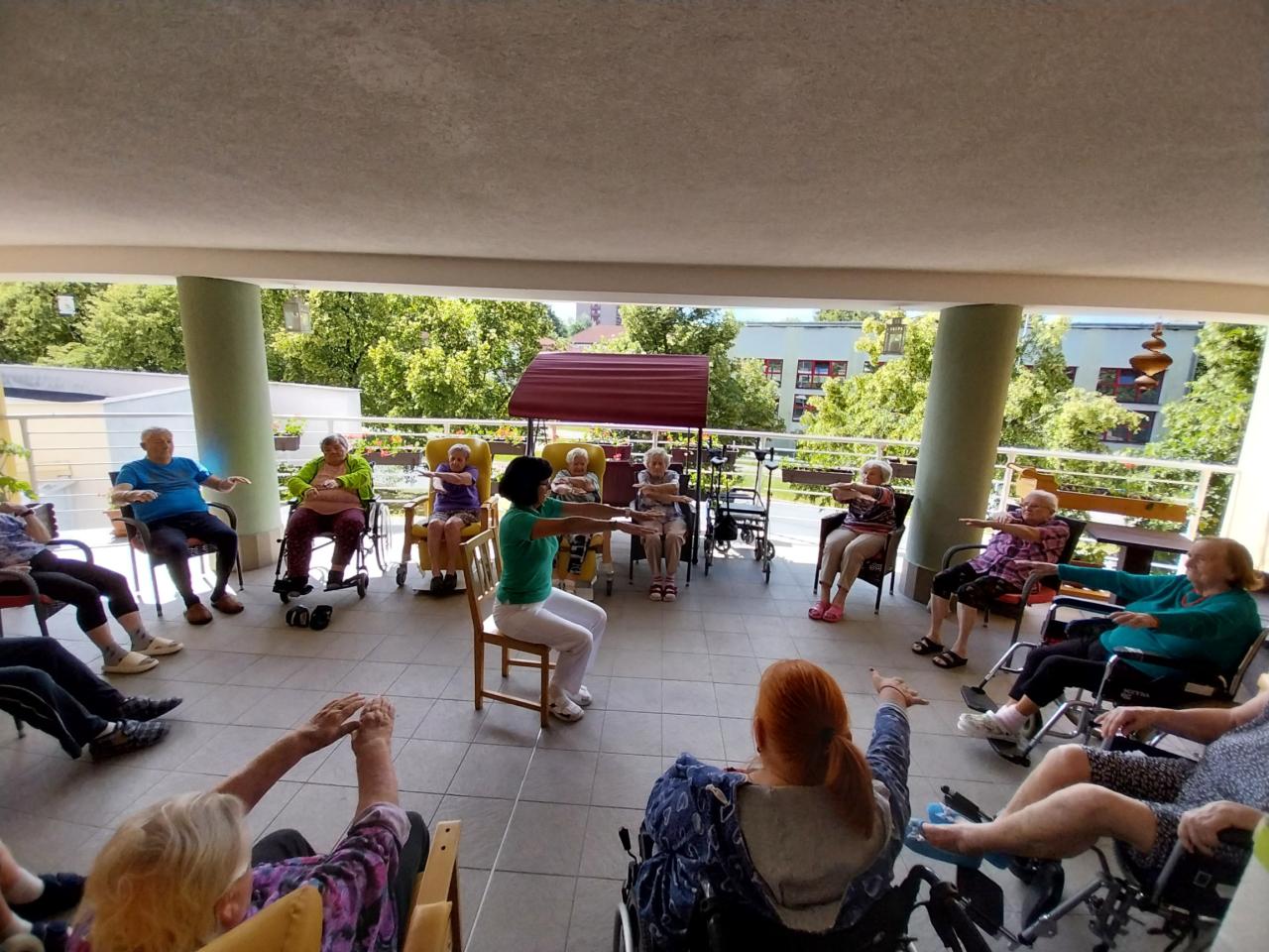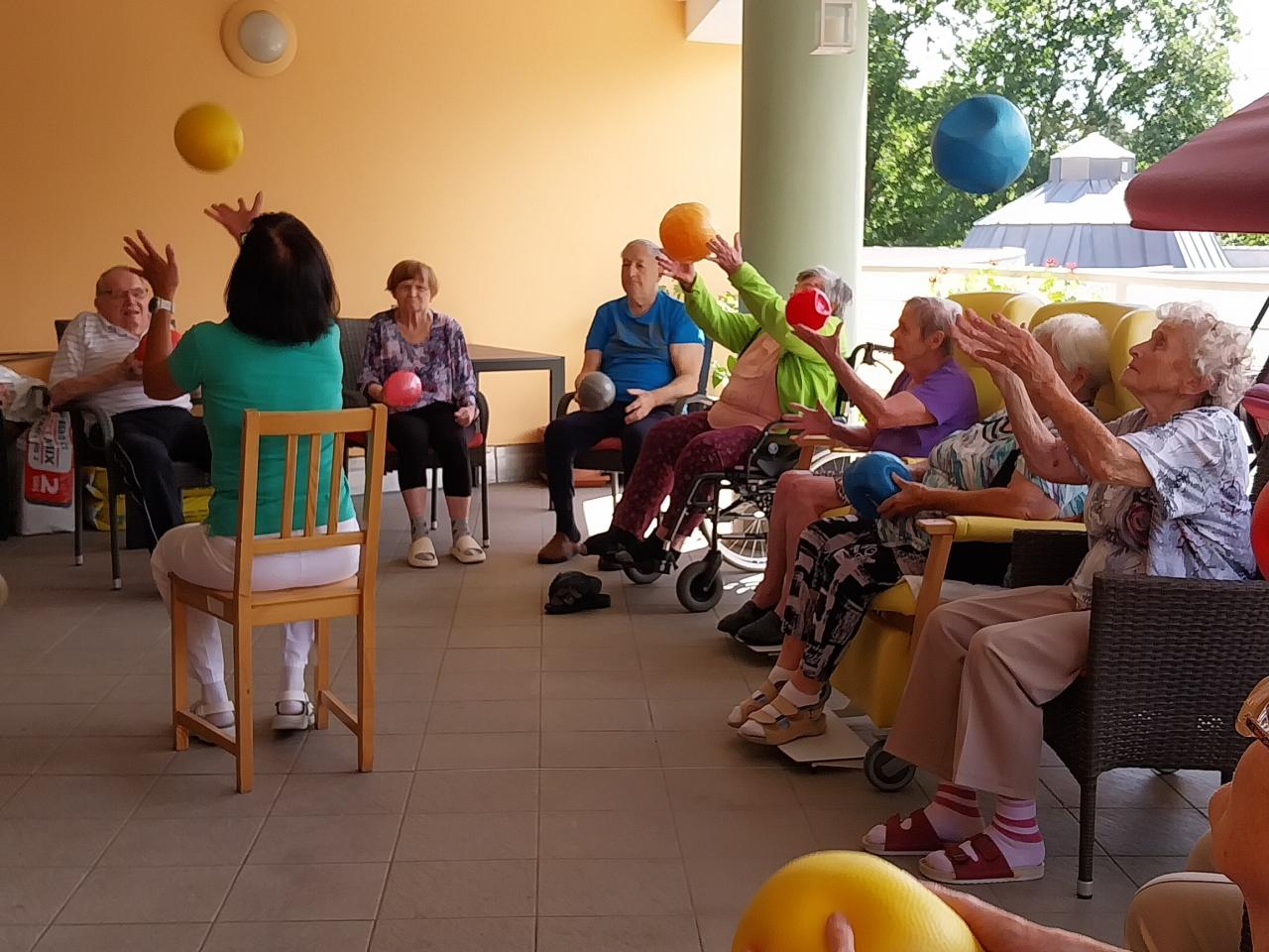 Následovalo sportovní dopoledne, které proběhlo ve znamení lehkého pohybu. Senioři si vyzkoušeli jednoduché cviky a hry zaměřené na koordinaci a posílení těla. Podobně oblíbené je i pravidelné skupinové cvičení, které probíhá během týdne, a přispívá k udržení fyzické kondice i dobré nálady.