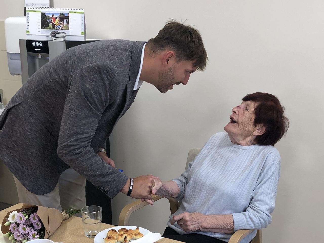 Srdečné blahopřání přišel předat pan Marcel Sikora, náměstek primátora statutárního města Frýdek-Místek, který jubilantkám popřál pevné zdraví, klidné dny a radost ze života. Za naše zařízení se připojil také ředitel domova, který ocenil jejich životní příběhy, sílu a optimismus. Oba pánové nezapomněli přát i dnešní oslavenkyni, která měla svůj slavnostní den právě během setkání. Nechyběla ani květina a drobná pozornost pro všechny dámy.
