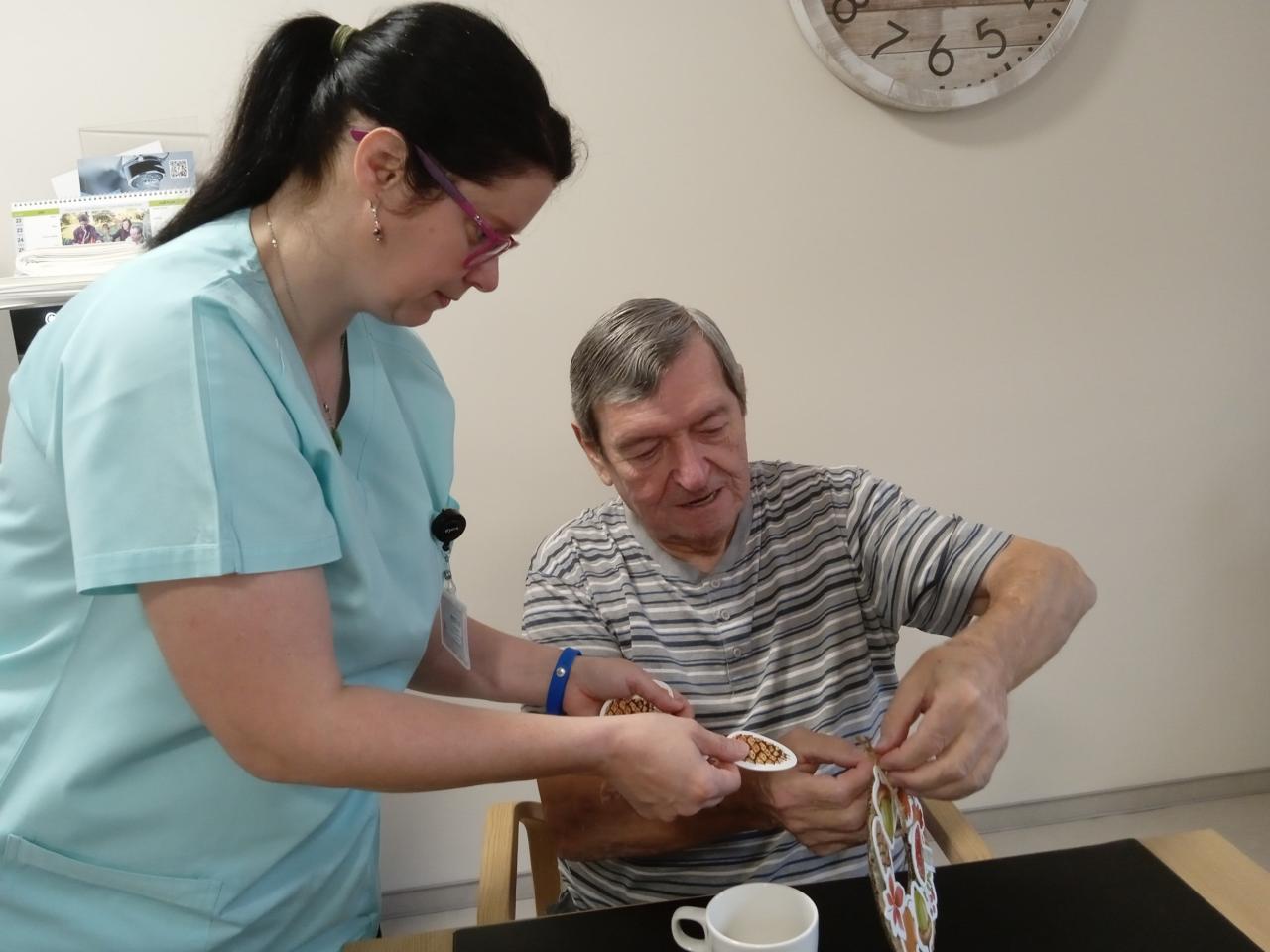 S chutí se pustili do tvoření, z lepenky a barevných motivů vyráběli krásné dekorace, při jejichž tvorbě vyzkoušeli i netradiční tupovací techniku. Soustředěná práce přinesla radost i spokojenost, protože výtvory se opravdu povedly. Když bylo téměř hotovo, přišla na řadu káva, která příjemně zakončila celé setkání. Nové, zdánlivě jednoduché dekorace nyní zdobí pokoje uživatelů a připomínají, že společně strávený čas má smysl a přináší velkou radost.