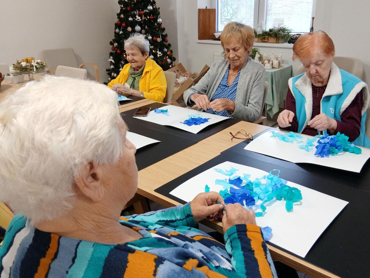 Než se káva podávala, využili čas k tvoření, při kterém pomocí speciální techniky procvičili nejen fantazii, ale i jemnou motoriku. Pod jejich rukama postupně vznikala krásná díla a celé setkání provázela velká radost z tvoření i ze společně stráveného času.